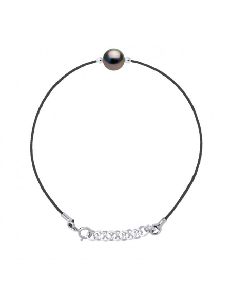 Bracelet Lien Nylon Tressé de couleur NOIRE orné d'une Véritable Perle de Culture de TAHITI Ronde 8-9 mm - longueur 18 cm - Longueur 18 cm