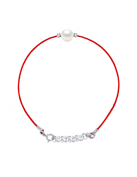Bracelet Lien Nylon Tressé de couleur ROUGE orné d'une Véritable Perle de Culture d'Eau Douce Blanche et Ronde 8-9 mm entourée de 2 Véritables Diamants de 0,03 Cts - Longueur 18 cm